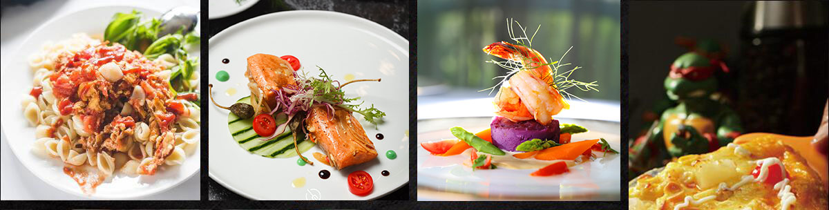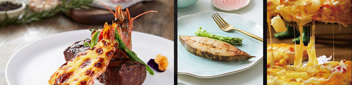 中西融合菜:蒜香柠檬烤鱼、龙利鱼配红椒汁、海苔猪扒卷、鲜菌培根意粉、芝士海鲜焗意粉、红葱头菲力牛排、香草蛋黄酱焗鲍鱼等。